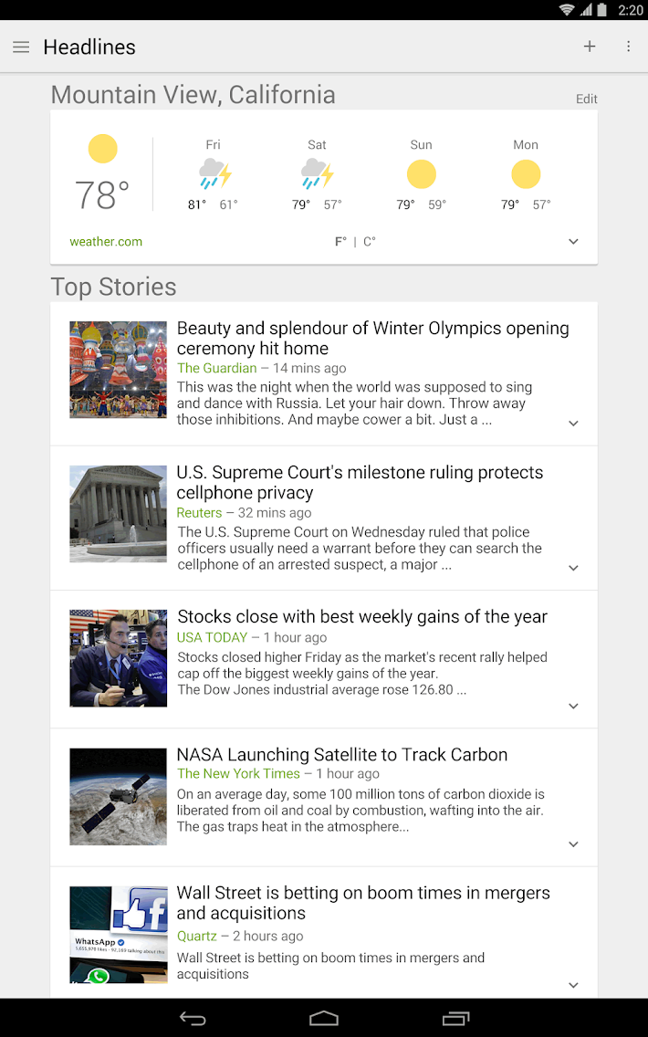 Сегодня Google представила масштабное обновление для своего приложения "Новости и погода", которое, кажется, давно было забыто компанией. В новой версии приложение получило абсолютно новый пользовательский интерфейс Material Design. Теперь программа выполнена в карточном стиле и напоминает сервис Google Now. При этом функциональность приложения осталась без изменений: вы можете просматривать новости по различной тематике и получать информацию о прогнозе погоды.
